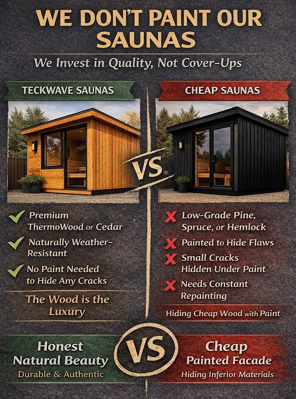 - Worried about pricing? At TECKWAVE, we keep things efficient. By avoiding inflated marketing and distribution costs, we offer premium saunas at highly competitive prices—without compromising on quality or features.